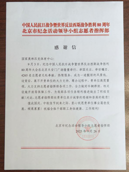 近日,国家奥林匹克体育中心收到由中国人民抗日战争暨世界反法西斯战争胜利80周年北京市纪念活动领导小组志愿者指挥部颁发的感谢状及感谢信,表彰中心在9月3日纪念大会志愿服务保障工作中的突出贡献,这份荣誉既是对奥体中心保障工作的肯定,也彰显了中心承接国家级重大活动的专业能力。