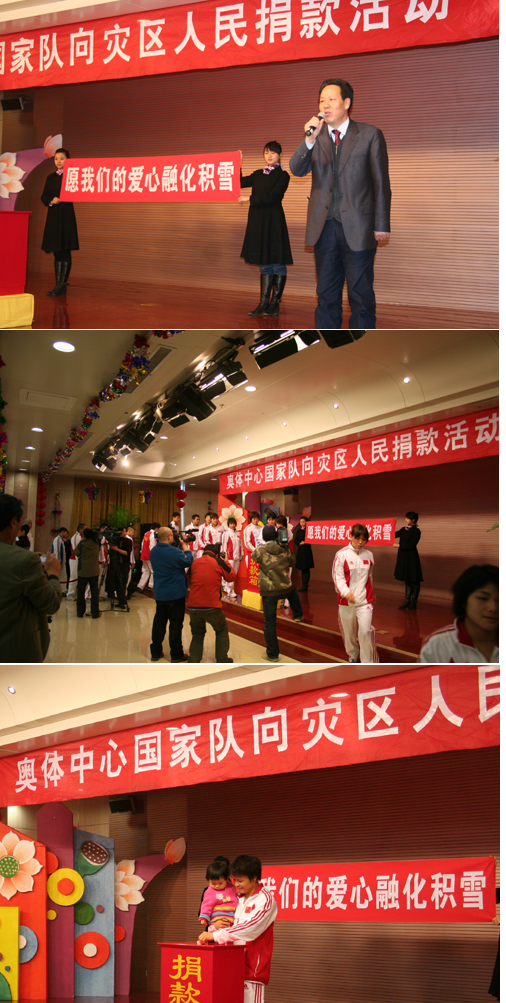 2月5日上午,奥体中心、驻训国家队开展了“愿我们的爱心融化积雪”向灾区人民捐款活动。 奥体中心主任马敬宣作了讲话,中心其他领导带头捐款。奥体中心驻训的七支队伍(国家男、女手球队,国家男、女柔道队,国家男、女摔跤队,国家拳击队),共有310名教练员、运动员参加了捐款活动,共捐献人民币42090元。中心干部职工551人,共捐款39425元。此次活动共捐款81515元。 中央电视台、北京电视台等11家新闻媒体对捐款活动现场进行拍摄和录像。活动结束后,媒体对教练员、运动员进行了采访。