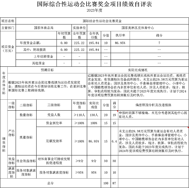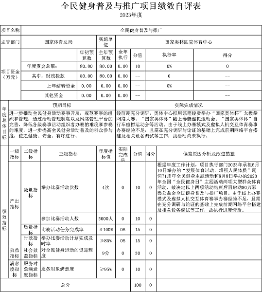 奥体中心2023年度需要绩效自评的项目共10个,自评总金额28331.49万元,其中上年结转资金1302.4万元,当年财政资金24046.02万元,自筹资金2983.07万元。涉及项目包括:场馆及附属设施运行经费、直属场地维修及设备购置、奥体中心英东游泳馆改造项目、奥体中心智能场馆建设项目(一期)、全民健身普及与推广、国家队备战经费、国际比赛及国际交流、奥运争光计划纲要保障、国家队训练津贴、国际综合性运动会比赛奖金,自评覆盖率100%。