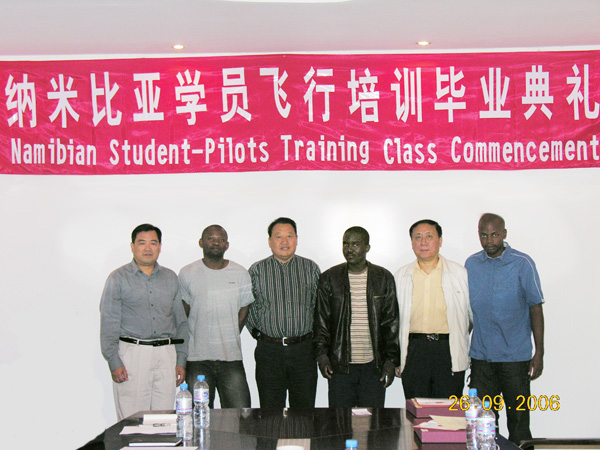 2006年9月26日上午,安阳航校为纳米比亚飞行学员举行了毕业典礼。全体校领导、中航技领导、飞行教官和有关科室领导参加了毕业典礼,毕业典礼由金达敏副校长主持,训练科长李善民分别宣布了3名学员的学习成绩;学生代表、教官代表先后发言,学员代表绍西尼在发言中讲到“安阳航校给他们留下了深刻印象,永远不会忘记自己的母校”;金嘉庆处长代表中国航空技术进出口总公司,向安阳航校给予的大力支持和教官的耐心施教表示感谢;于宗镭校长代表安阳航校对学员取得的优异成绩表示祝贺,并为学员颁发了毕业证书和纪念品。 卡飞塔(K.HAITA ) 、努乔马(PN.Nuyoma ) 、绍西尼(P.Saushini) 三名学员于2006年5月15日来到安阳航空运动学校(中国航空技术进出口总公司安阳飞行培训基地),进行R-22直升机飞行培训,历时近5个月的时间,完成了航空理论学习、直升机悬停起落、航行、夜航、机动飞行等专业科目训练,每人飞行 75小时,较熟练掌握了R-22直升机飞行技能。