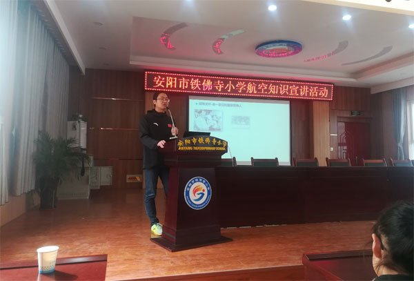 3月5日是学雷锋纪念日,也是中国青年志愿者服务日。为纪念毛泽东同志题词"向雷锋同志学习"56周年,进一步弘扬“奉献、友爱、互助、进步”的志愿者精神,安阳航校根据省、市、区文明办的工作部署,并结合学校独特优势,于3月5日、3月7日组织开展了两场青少年航空科普进校园特色志愿服务活动。 3月5日、3月7日安阳航校志愿者分别来到安阳市铁佛寺小学、钢三路小学,为两个学校共八个班、400余名学生带来了一次精彩的航空科普活动。在活动现场,志愿者们精心制作的PPT和视频为孩子们带来了一场生动的航空知识科普课。 经营处副处长李志业,为同学们介绍了安阳航校的情况,激起了同学们对航空探索活动的兴趣,在同学们的心中埋下了一颗航空的种子。 国家队教练员翁华南,以“吃鸡”游戏为切入点,生动地讲解了跳伞运动的起源与发展,与同学们的互动体验更是把会场气氛带到了高潮。 训练处飞行教员吴晓贝,通过同学们爱玩的“竹蜻蜓”与直升机之间的联系,深入浅出地为同学们介绍了直升机的各类机型与飞行原理,并详尽地解答了同学们提出的各种问题。 殷都区文明办李建武主任也莅临现场指导工作,活动结束后,李主任结合安阳航校自身特点与发展与安阳航校的同事们进行了深入的交流,并提出了许多建设性建议,给我们今后的工作带来不少启迪。 安阳航校青少年航空科普进校园特色志愿服务活动充分展示了航空的魅力,体现了安阳航校志愿者的志愿服务精神。整个活动受到了广大师生的一致欢迎和好评,取得了良好的社会效应。
