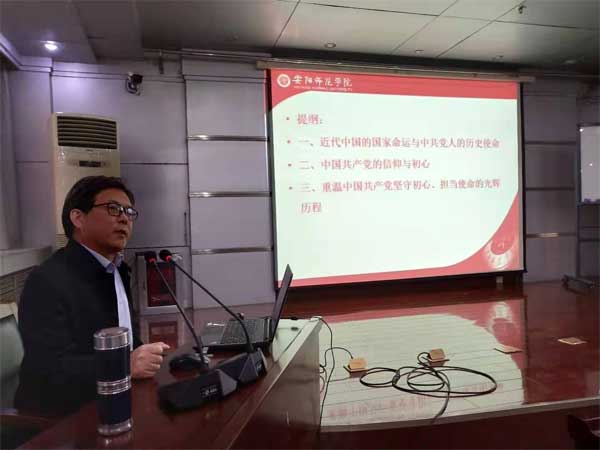为深入贯彻落实中央 《关于在“不忘初心、牢记使命”主题教育中认真学习党史、新中国史的通知》要求,10月24日下午,校党委特邀请安阳师院柴俊青教授辅导学习党史,举办“重温党的历史,追寻初心和使命”党史学习辅导讲座,学校全体职工参加了活动。 通过学习,大家对中国近代的历史发展脉络、基本国情、中国的社会、革命性质、共产党人的信仰和初心等方面有了进一步的认识和了解。 最后,张俊铭校长要求大家:要继续深入学习党史和新中国史,重温共产党人的初心和使命,自觉投入到学校建设中去,提高责任感和使命感,不忘初心,牢记使命,砥砺前行,立足本职工作,为学校改革发展稳定贡献力量。