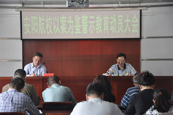 2016年4月25日,安阳航校召开以案为鉴警示教育动员大会。全体党员及队级以上干部参加了会议。 学校党委副书记、校长金达敏作动员报告。金达敏校长要求大家,一要积极认真学习贯彻习近平总书记系列重要讲话和批示指示精神,从严治党,强化党的纪律意识和规矩意识;二要落实“两个责任”,强化使命担当;三要树立正确的政绩观,为航空体育事业健康发展做贡献;四要纠正行业不正之风,优化学校发展环境。并针对学校开展以案为鉴警示教育,金达敏校长强调,一要全校上下高度重视,充分认识到航空体育事业发展面临的诸多挑战和机遇。二要党员干部增强“四种意识”,发挥模范带头作用,勇担当、敢作为、顾大局。三要加强对党员干部的监督管理,狠抓苗头性、倾向性问题,防微杜渐。四要将管人与管事有效结合,把纪律和规矩挺在前面。