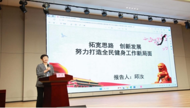 邱汝以《拓宽思路 创新发展 努力打造全民健身工作新局面》为主题,明确了全民健身公共服务体系的目标、内容、标准与政策,提出要不断开辟新思想、提出新办法、实施新举措,促进新发展;要坚持在“全民”上做文章,在“健身”上下功夫,通过宣传健身把群众发动起来,通过亲民健身让群众参与进来;要夯实“政府主导、部门协同、全社会共同参与”的大群体工作格局并不断推动改革创新,持续推动群众体育发展提档升级,优化全民健身发展环境。