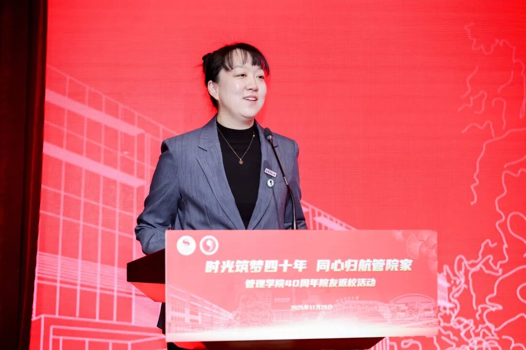 管理学院院长黄海燕回顾了学院四十年发展的光辉历程。从早期探索体育管理人才培养模式,到构建起覆盖本科、硕士、博士的完整育人体系,学院累计培养五千余名毕业生,他们不仅遍布体育行政、赛事组织、产业运营等体育领域,成为行业发展的中坚力量,并在工商、文旅、公安、媒体等各行各业发光发热,展现出北体管理人视野开阔、能力卓越、勇于担当的鲜明特质。黄海燕向所有关心和支持学院发展的院友、师生及社会各界表达衷心感谢,并表示学院将继续强化学科建设,深化产教融合,依托院友资源搭建更高质量的发展平台,助力中国体育事业不断向前。