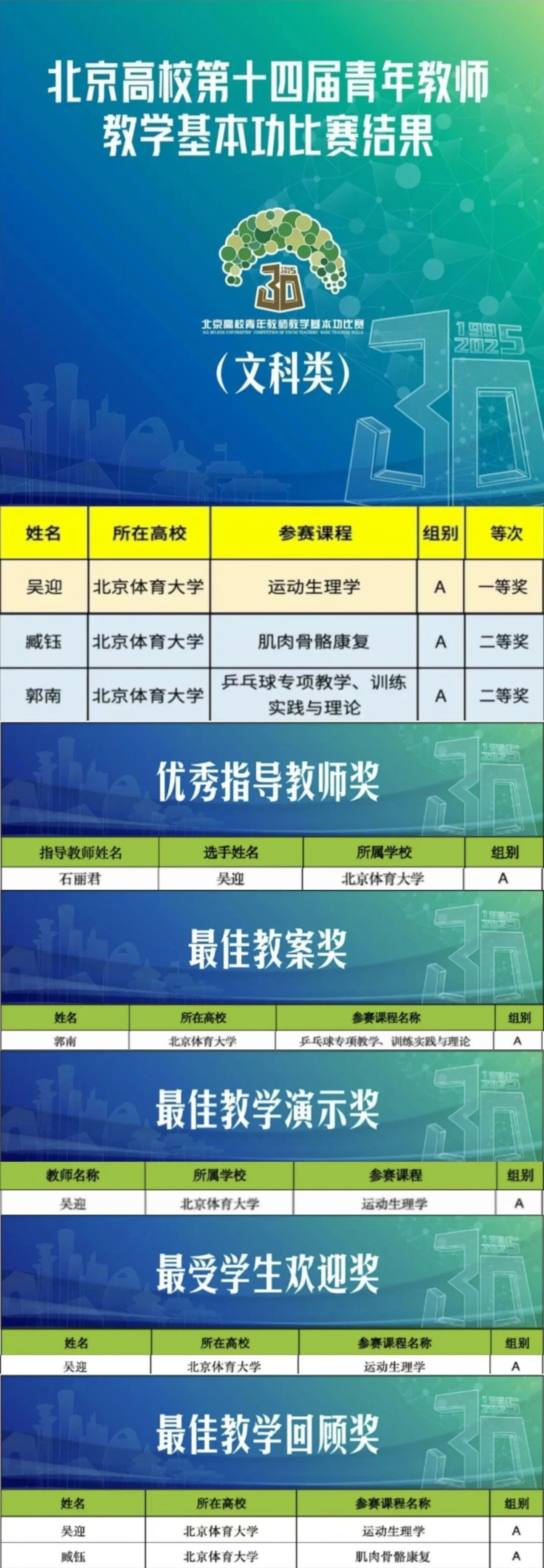 近日,北京高校第十四届青年教师教学基本功比赛文科组竞赛结果揭晓,我校参赛选手获得优异成绩。运动人体科学学院吴迎获文科类一等奖,运动医学与康复学院臧钰和竞技体育学院郭南分别获文科类二等奖。在各单项奖中,吴迎夺得最佳教学演示奖、最受学生欢迎奖以及最佳教学回顾奖;其指导教师石丽君获评优秀指导教师奖。郭南老师获得最佳教案奖,臧钰老师亦荣获最佳教学回顾奖。