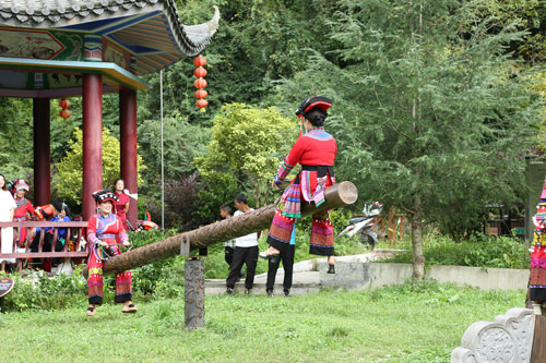 另外还有两种秋千。一种是观音秋,“彝语叫冲嘎烂,冲是指秋千,嘎烂彝语里是半山腰上分枝盛开的鲜艳花朵;意思是我们彝族姑娘在荡观音秋时,衣裳鲜艳,像山间盛开的花朵或像观音下凡一般美丽。”余二龙介绍道。 另一种是磨磨秋,类似于跷跷板。这种磨磨秋不仅可以上下摆动,还能四面左右旋转,有着人生虽有起伏,但更多的是圆满的寓意,坐上磨磨秋的人们都会得到四方神福的保佑。