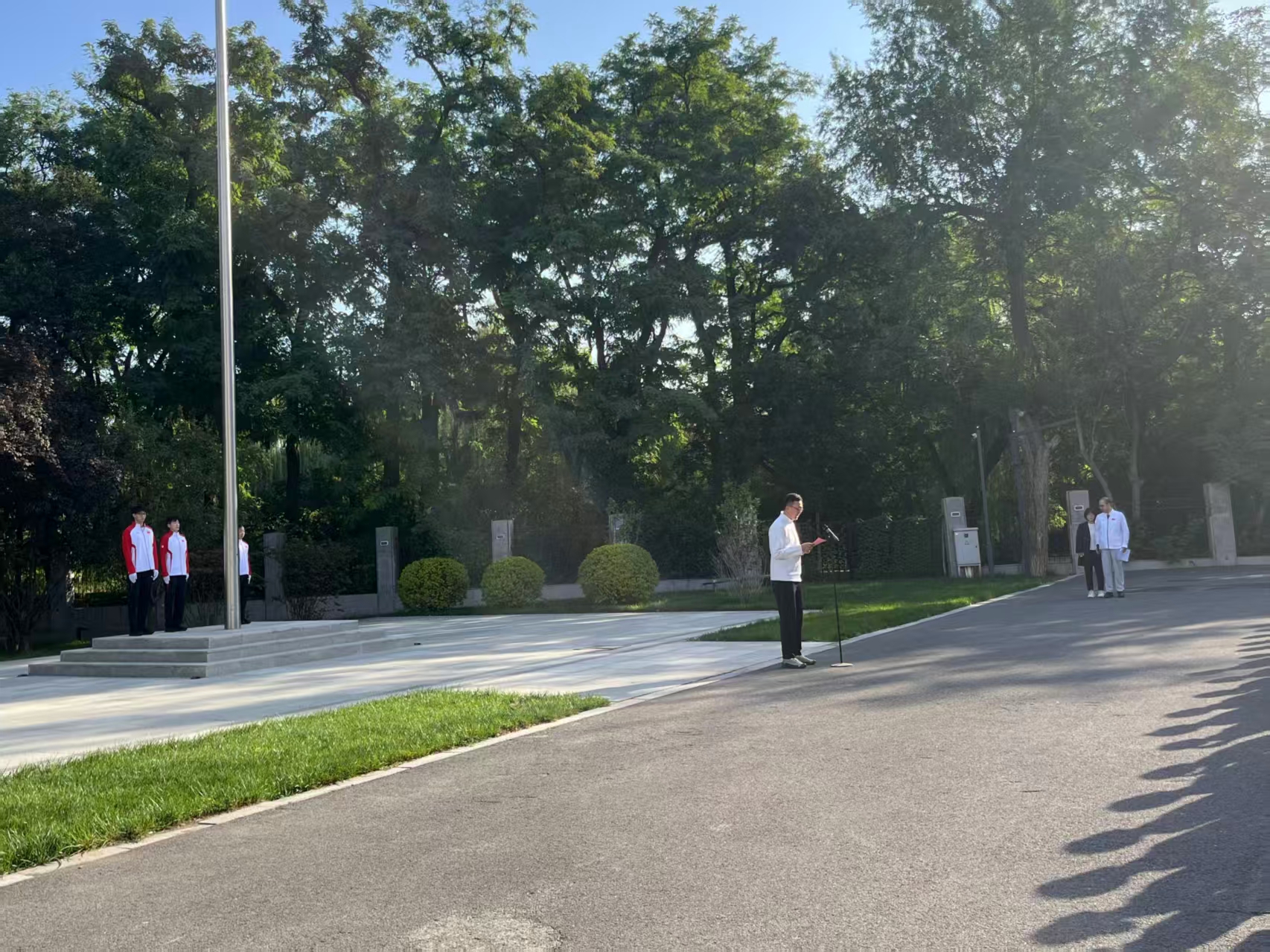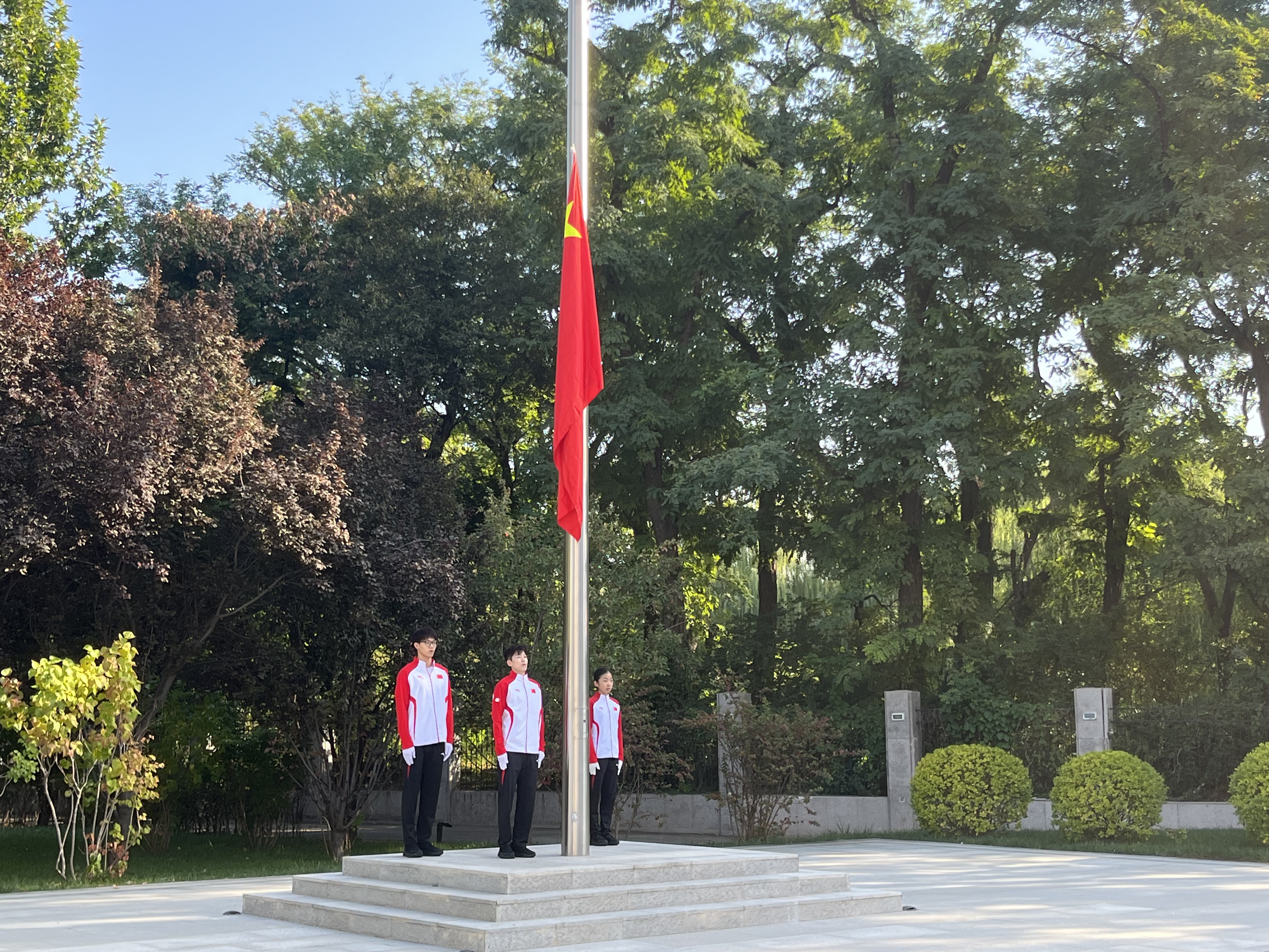 北京冬奥会冠军、国家短道速滑队运动员范可新担任升旗手,国家冰壶队运动员于森和国家花样滑冰队运动员张瑞阳担任护旗手。伴随着雄壮的国歌声,全体人员庄严肃立,深情凝视五星红旗冉冉升起,齐声高唱国歌。