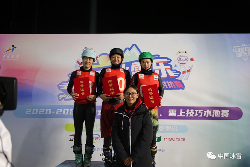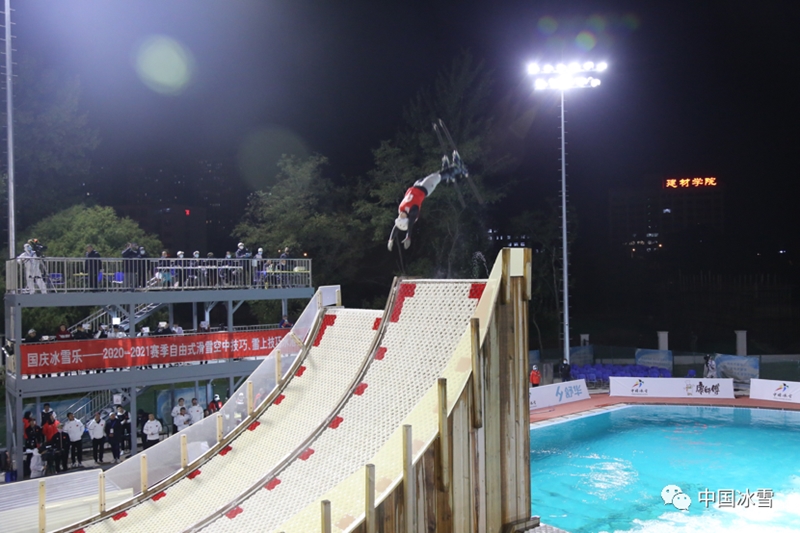 10月4日,“国庆冰雪乐”2020-2021赛季自由式滑雪空中技巧、雪上技巧水池赛进入第四个比赛日的争夺--空中技巧成年组自选动作比赛。