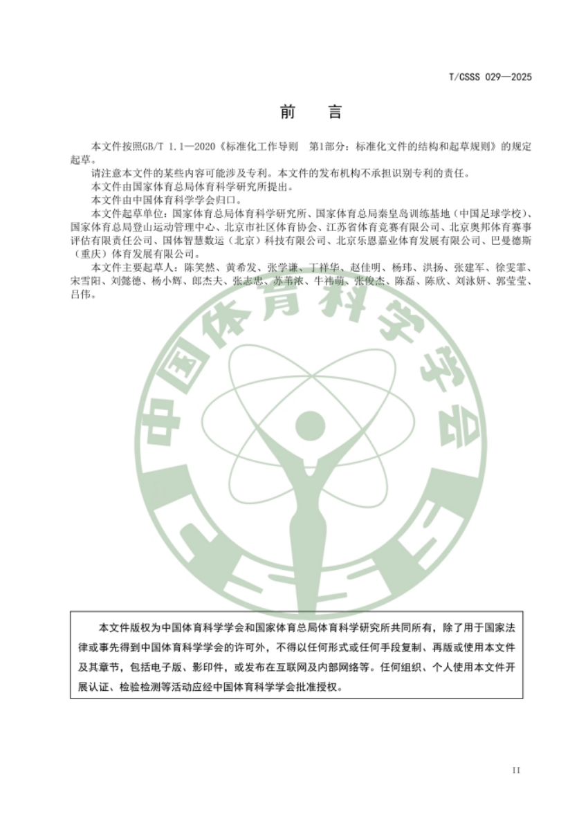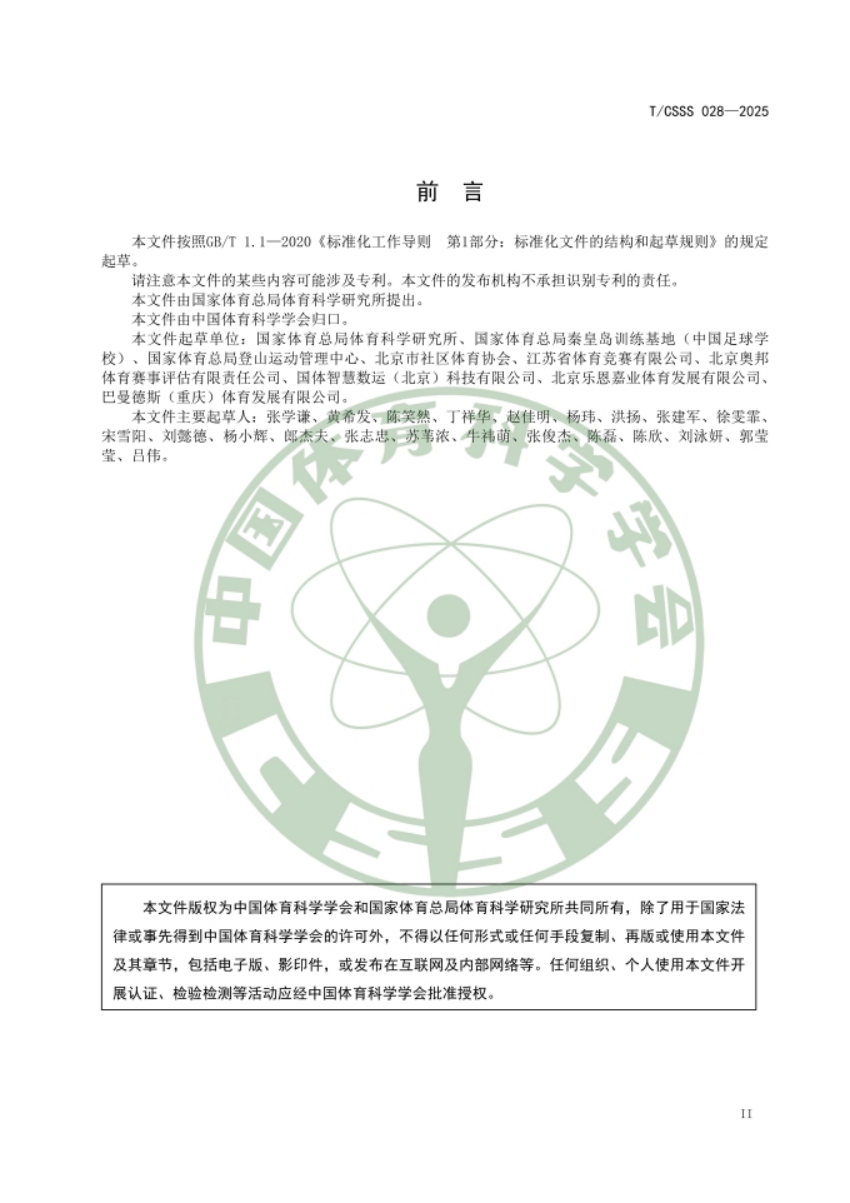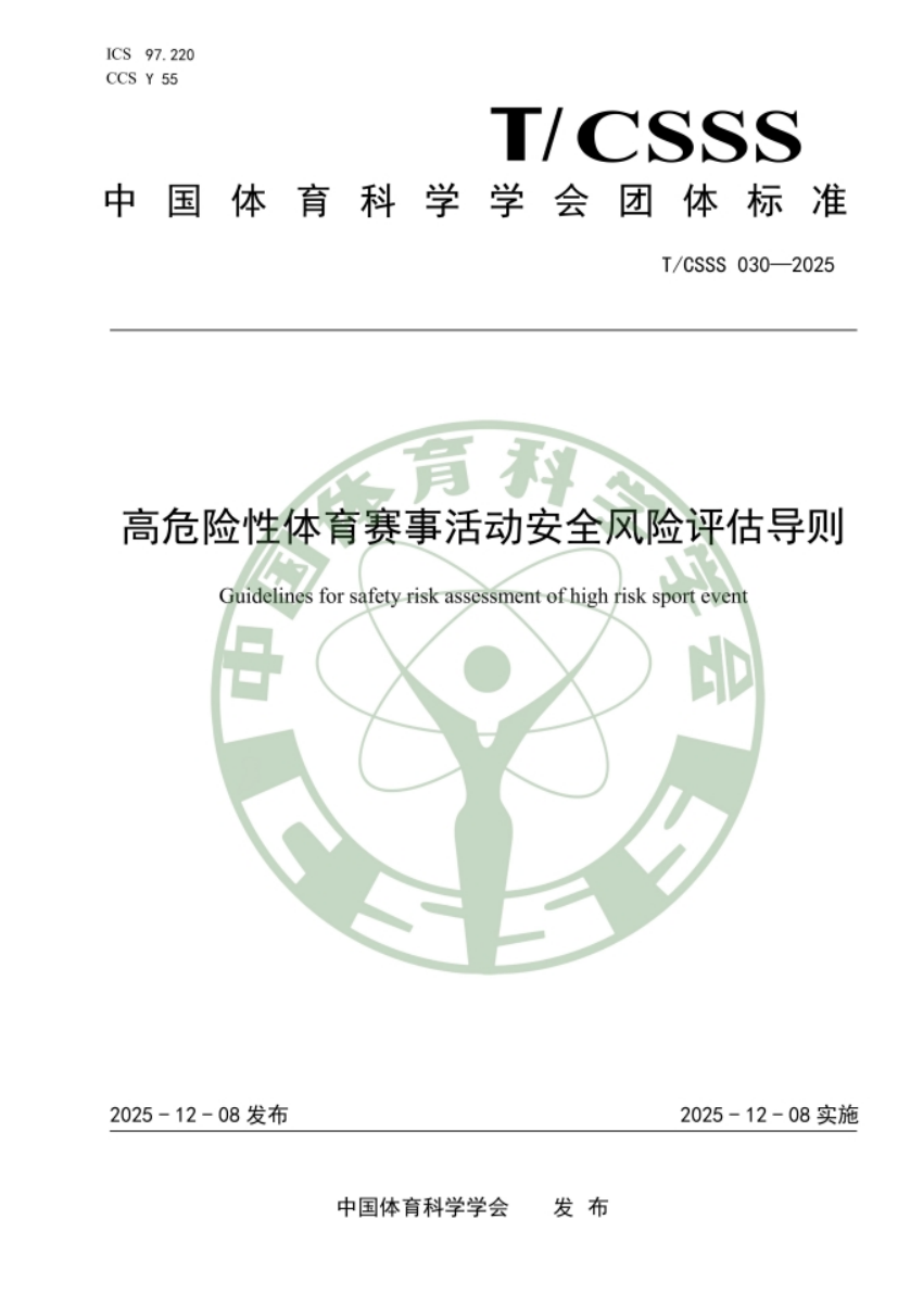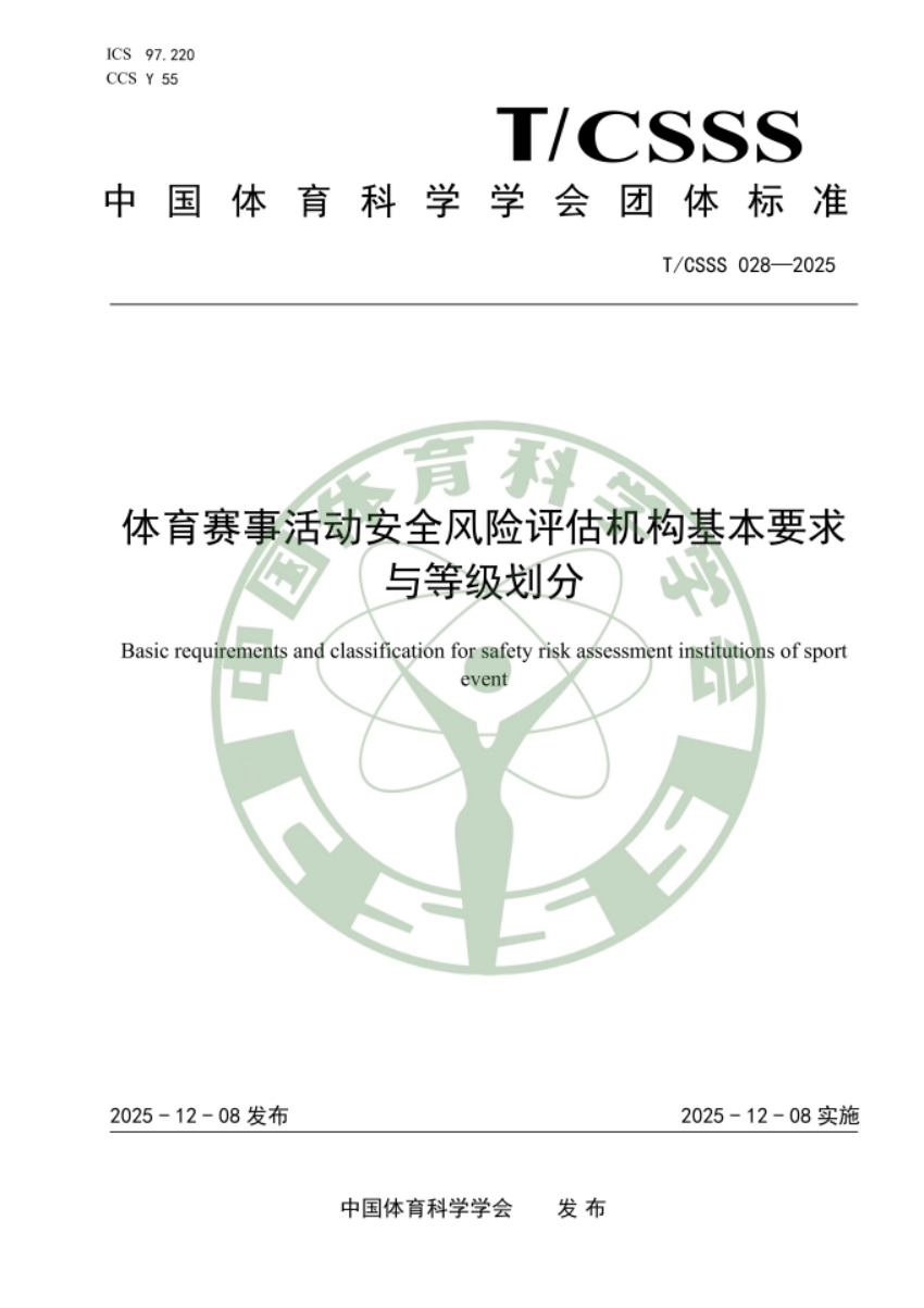 近日,中国体育科学学会发布了T/CSSS 028—2025《体育赛事活动安全风险评估机构基本要求与等级划分》、T/CSSS 029—2025《体育赛事活动评估人员能力通用要求与等级划分》和T/CSSS 030—2025《高危险性体育赛事活动安全风险评估导则》3项团体标准,该系列标准由国家体育总局体育科学研究所牵头制定,中国体育科学学会归口管理。