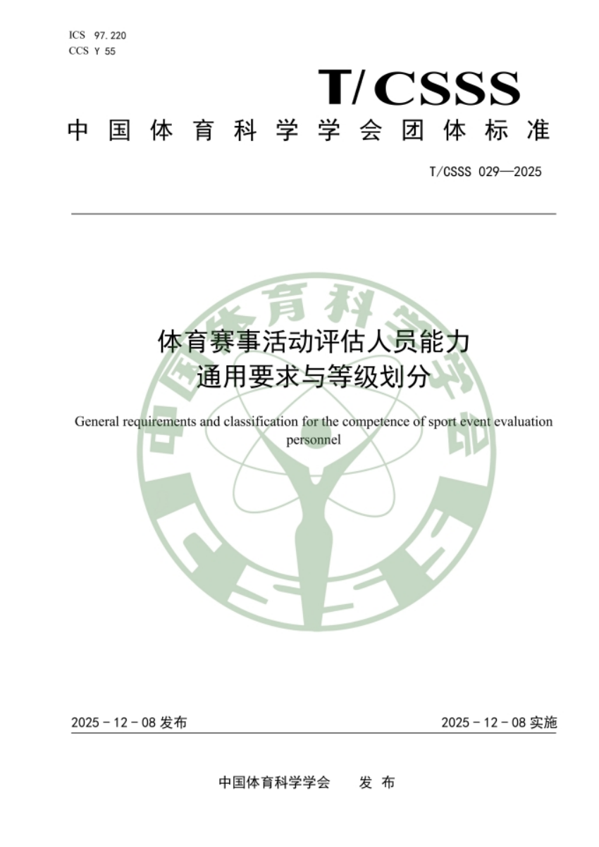 T/CSSS 029—2025《体育赛事活动评估人员能力通用要求与等级划分》规定了评估人员能力指标体系,包括知识、技能、品质、经验等内容,将评估人员能力划分为助理级、初级、中级、高级、特级五个等级,并给出各等级要求。