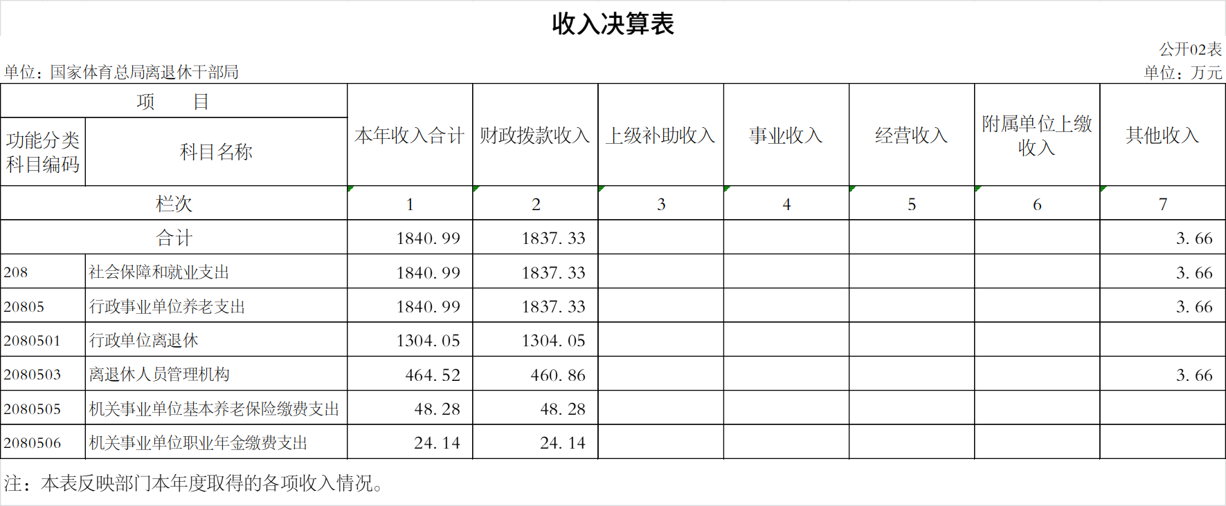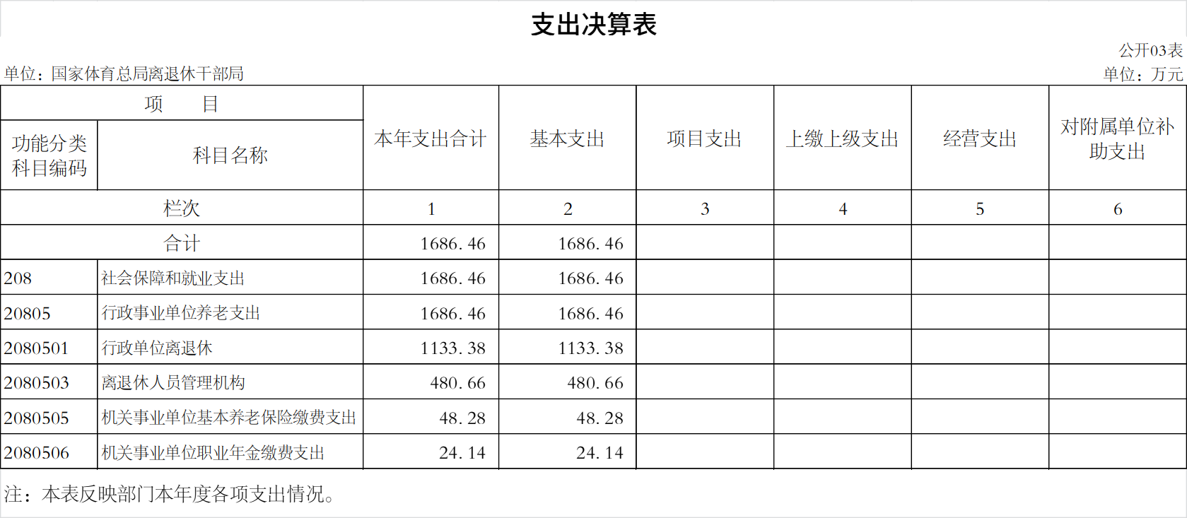 五、社会保障和就业(类)行政事业单位养老支出(款)行政单位离退休(项)(科目编码2080501):主要反映用于国家体育总局行政单位开支的离退休经费。