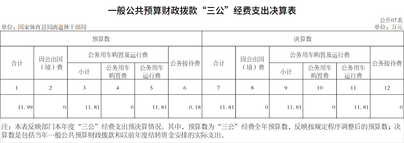 国家体育总局离退休干部局2021年度“三公”经费财政拨款支出预算为11.99万元,支出决算为11.81万元,完成预算的98.5%。