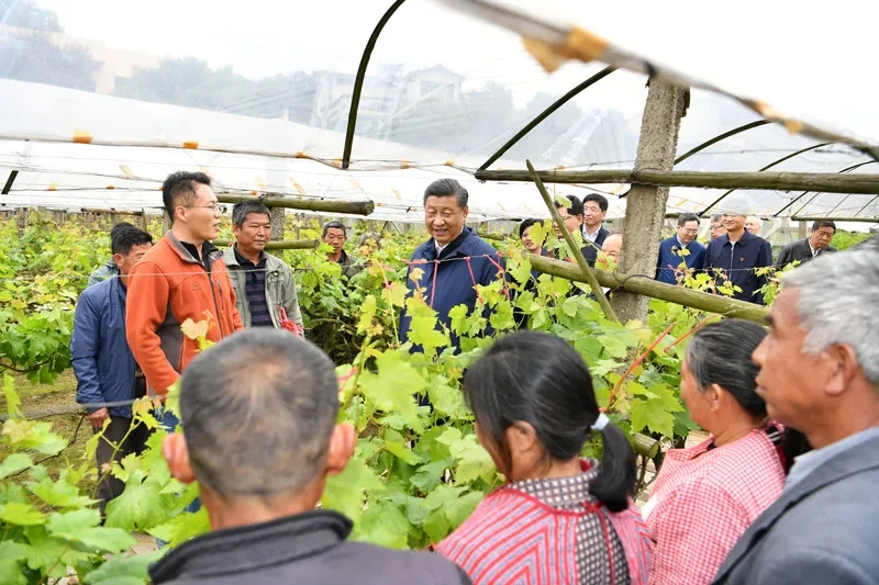 4月25日至27日,中共中央总书记、国家主席、中央军委主席习近平在广西考察。这是25日上午,习近平在桂林市全州县才湾镇毛竹山村,走进葡萄种植园,同农技人员和村民亲切交流。新华社记者 谢环驰 摄