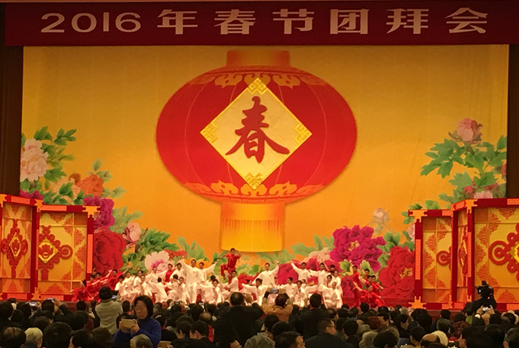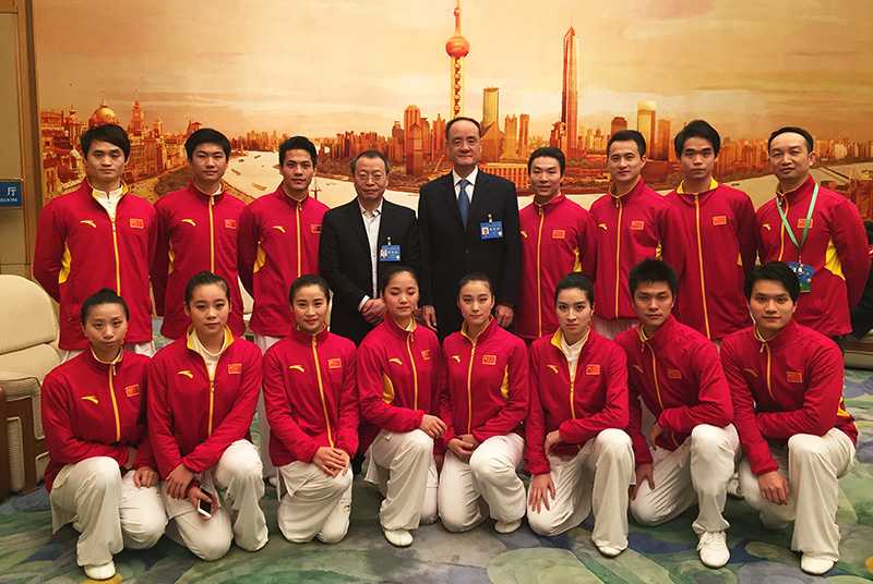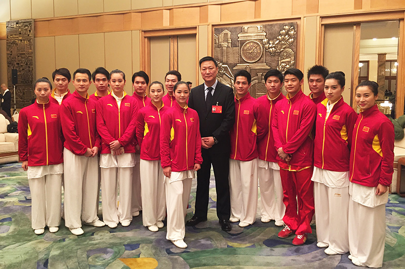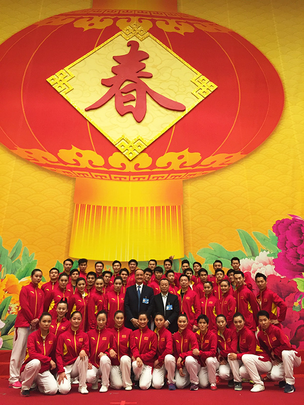 日前,中共中央、国务院在北京人民大会堂举行2016年春节团拜会。国家武术套路集训队受邀在春节团拜会上进行武术表演。时长5分钟的《中华魂》节目凝聚了来自全国11个单位的44名运动员和3名教练员的心血。这支表演队伍以福建和广东武术套路运动员为主要班底,队员中有14位世界冠军、4位亚洲冠军和14位全国冠军。他们中有人参加过北京奥运会开幕式武术表演,有人多次参加过春节晚会的武术表演。此次演出前,国家体育总局局长刘鹏、局长助理高志丹看望慰问了在京认真准备节目的国家武术套路集训队,向运动员、教练员们送去了新春祝福。