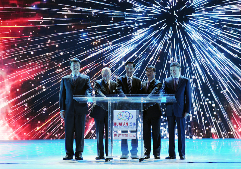 2016国际智力运动联盟智力运动精英赛于2月25日在江苏淮安开幕,国家体育总局副局长冯建中、江苏省人民政府副省长曹卫星、国际智力运动联盟主席伊柳姆日诺夫、中国桥牌协会主席项怀诚、淮安市委书记姚晓东等嘉宾出席开幕仪式并共同开启象征赛事正式启幕的智慧之光。