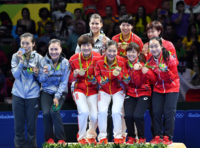 北京时间2016年8月17日,里约奥运乒乓球女子团体决赛展开争夺,由丁宁、李晓霞、刘诗雯组成的中国队3比0战胜德国队获得冠军。