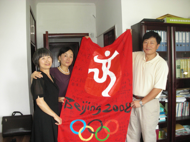 在奥运会开幕倒计时十天之际,30日上午来自延安北里社区的退役老人霍焰带着一份“沉甸甸”的礼物--百名老人签名的奥运会五环旗和2008元钱来到了辽宁省体育局。霍焰说:“这是我们送给北京奥运的祝福,以自己的方式为奥运加油,想委托体育局,把我们这份特殊的礼物转交给奥组委。”省体育局办公室主任石春元热情地接待了她,并对这些可爱的老人们表示感谢。