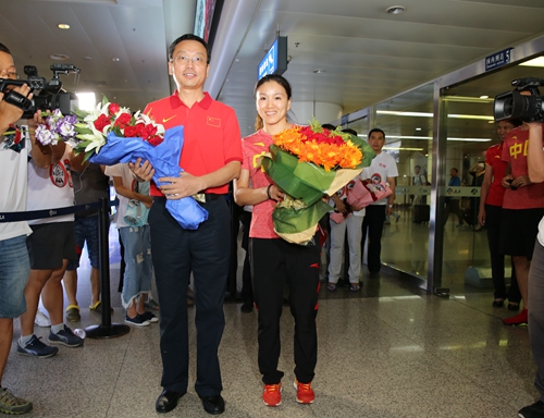 8月21日中午12点50分,里约奥运会场地自行车女子团体竞速赛冠军,我省名将宫金杰回到长春,受到亲人、队友、教练和大批媒体的热情迎接。