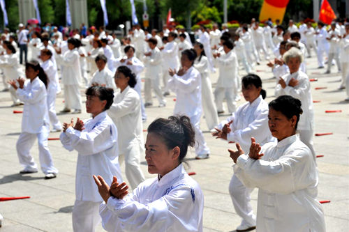 随后,现场举行了2000多人参与的广场舞、太极拳、柔力球、健身球操、轮滑等项目表演。当第十三届全运会群众项目黑龙江省首金获得者之一的柔力球混合双打冠军李建国和柔力球男子单打冠军崔龙江出现,并激情讲述参加全运会的经历和感受时,迎来现场观众阵阵掌声。