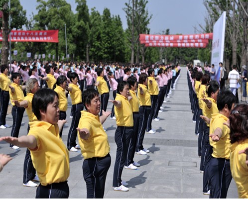 5月24日下午,上海市嘉定区百队千人系列赛练功十八法展示暨2013年嘉定新城(马陆镇)全民健身展示活动在嘉定新城远香湖畔举行,来自嘉定新城(马陆镇)各村、居委的1000余名运动员以整齐划一、刚柔并济的动作,共同展示练功十八法的健身魅力。