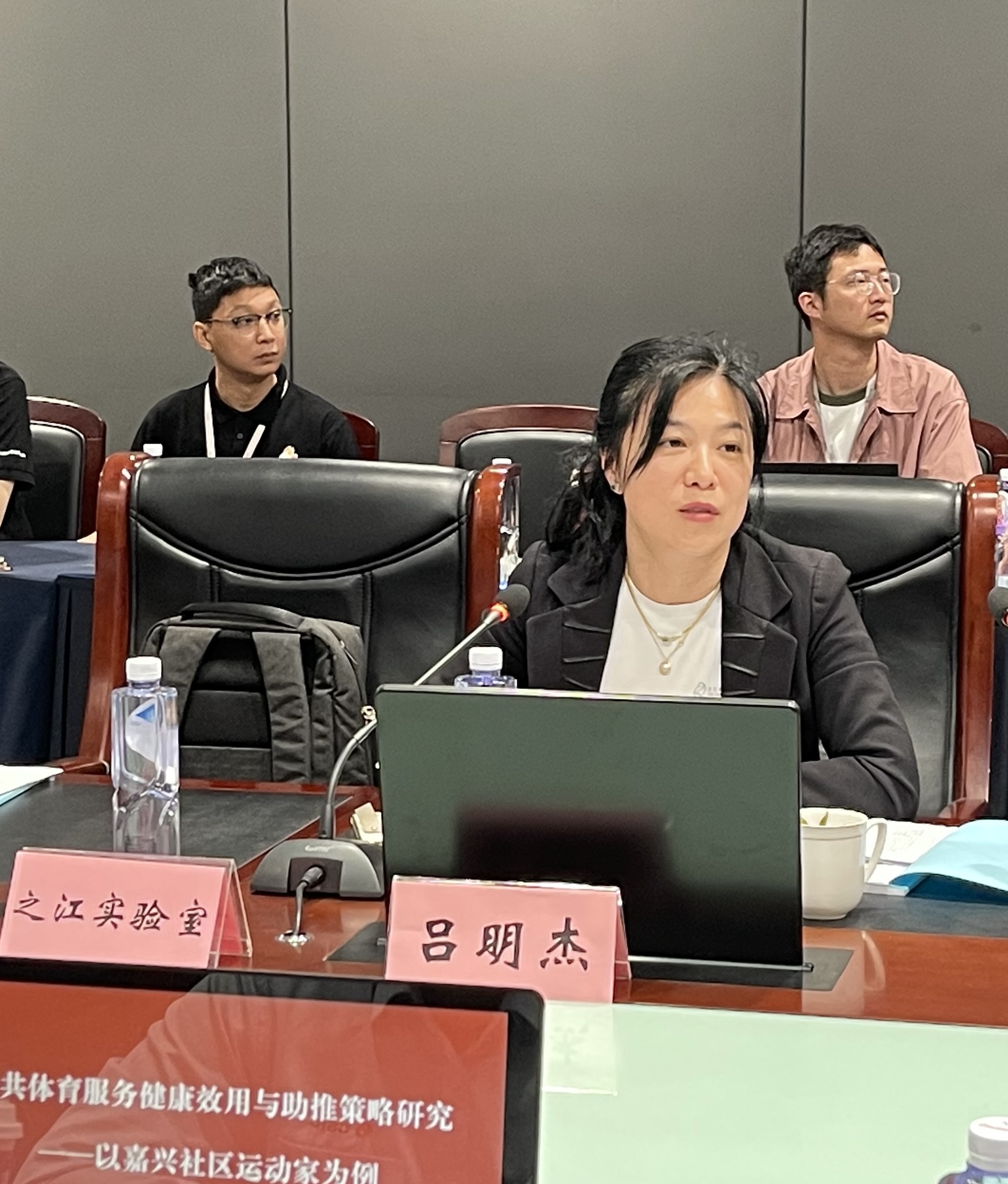 研究主体支撑单位之江实验室汇报介绍了嘉兴基地智能社会治理实验的三个课题方向:一是体卫融合视域下运动健身投入与医疗支出效用关系研究;二是基于体卫融合的社区运动之家效用研究;三是基于公众运动健康的社区公共服务助推模式研究。通过现状分析、案例分析、行为实验,以嘉兴市社区运动家为例,探索公共体育服务健康效用与助推策略研究。