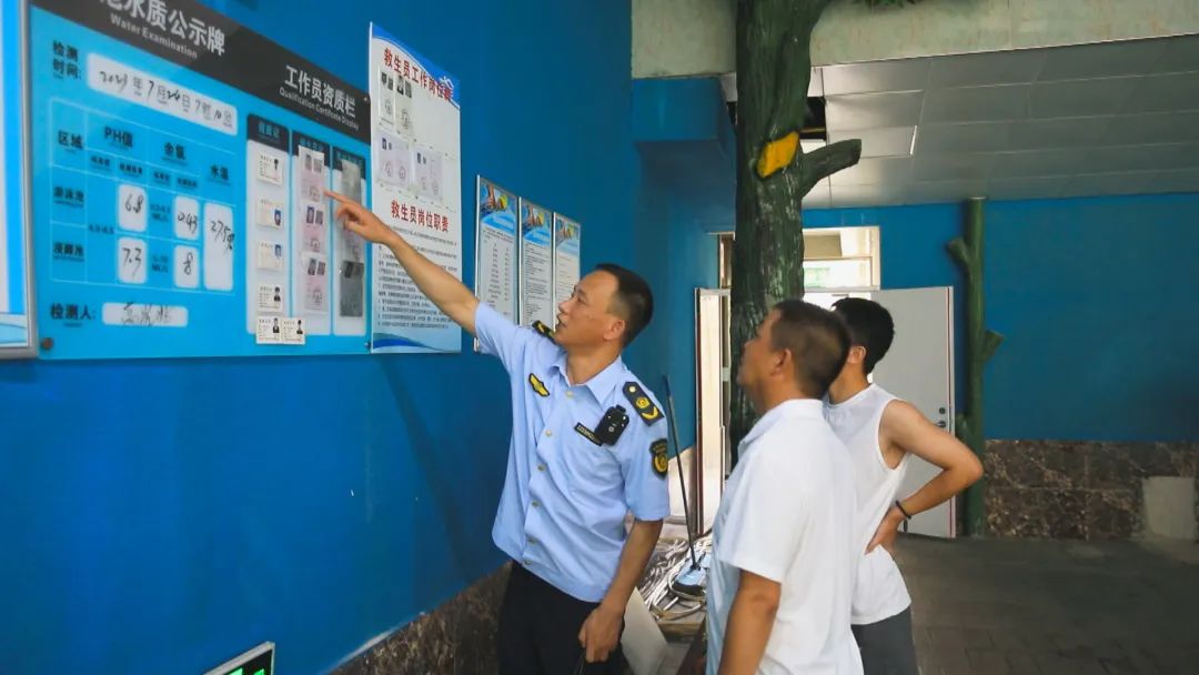 图为检查人员正在对桐城市一家游泳馆安全员从业资质进行仔细检查