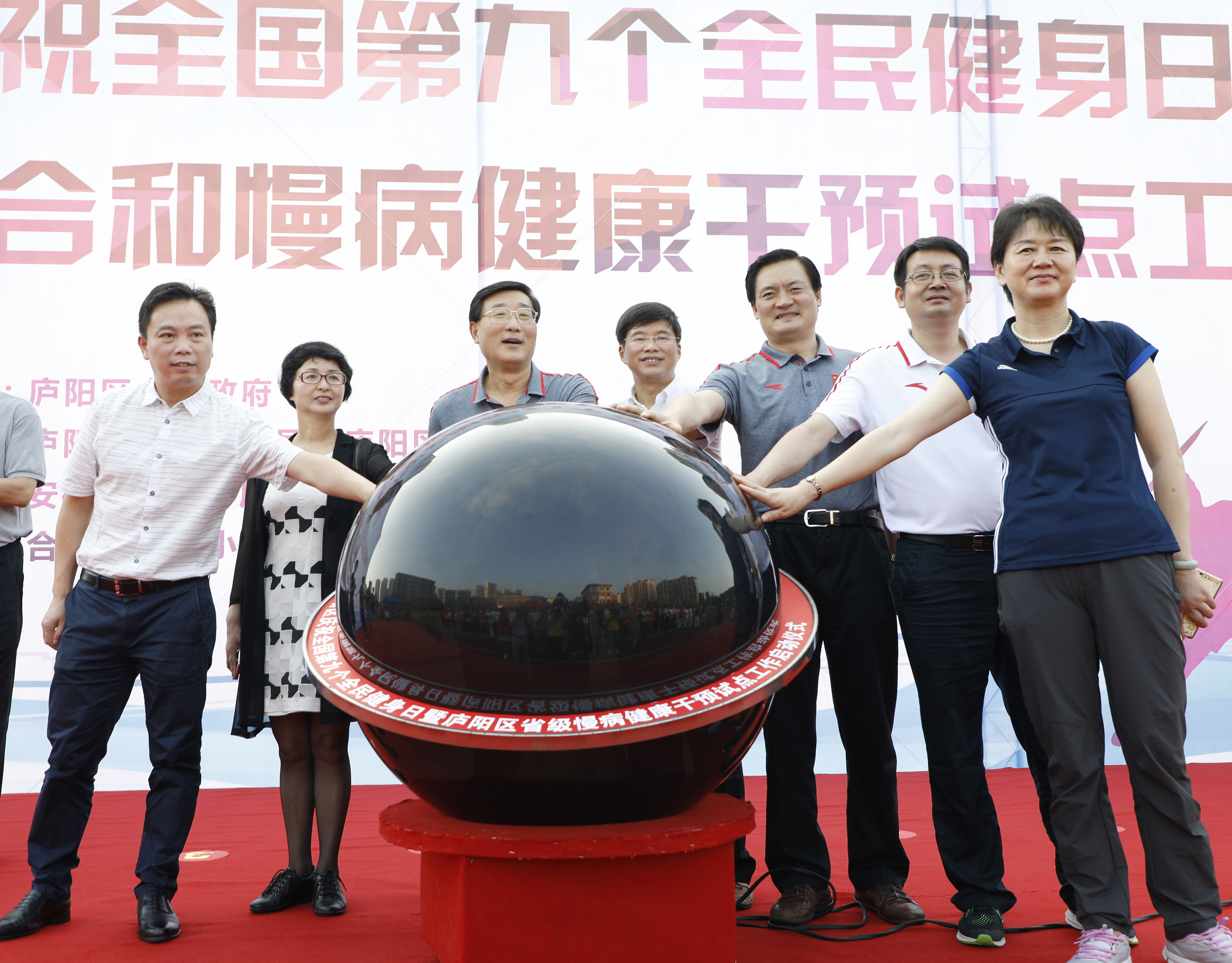 日前,2017年合肥庐阳区庆祝全国第九个全民健身日暨庐阳区省级体医融合和慢病健康干预试点工作启动仪式在南门小学万科森林城校区举行。安徽省体育局副局长陈海军、群体处长李永跃、社体中心副主任王勇、合肥市人民政府副秘书长谢军、合肥市体育局局长菅青、庐阳区委书记徐静平等领导与广大健身爱好者及辖区群众500余人共同参加了启动仪式。