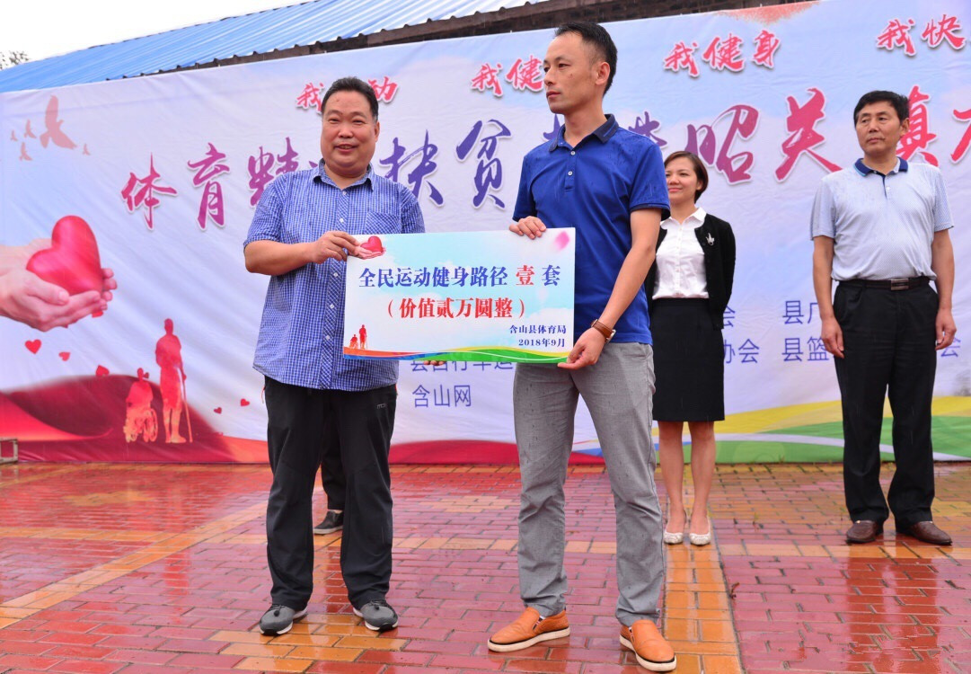 9月21日,安徽含山县体育局冒雨走进昭关镇大宣村,开展体育精准扶贫系列活动。此次活动含山县体育部门除了向该村捐赠爱心扶贫款、安装全民健身路径外,还组织县乒乓球、县广场舞、县太极拳、县篮球运动等相关运动协会的会员表演和传授广场舞、太极拳等,丰富村民的业余生活,增强村民的身体素质。