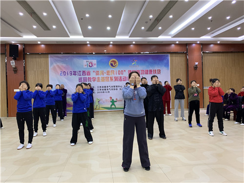 12月19日,2019年江西省“体育·惠民100”健身气功健康扶贫巡回教学走基层系列活动走进九江庐山市,来自全市的120多名健身气功爱好者参加了培训。