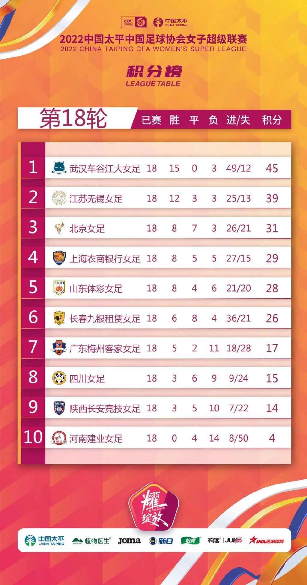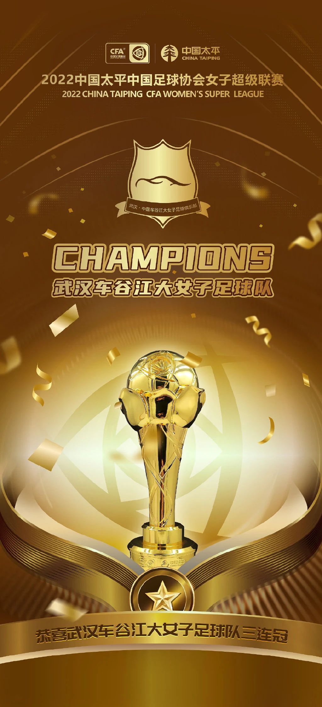 11月18日下午,2022中国太平中国足球协会女子超级联赛第十八轮全面战罢,武汉车谷江大女足0比1小负江苏无锡女足,最终以15胜3负积45分的战绩夺得联赛冠军。2020年-2022年,武汉车谷江大女足蝉联联赛“三连冠”,开创了属于自己的“新王朝”。