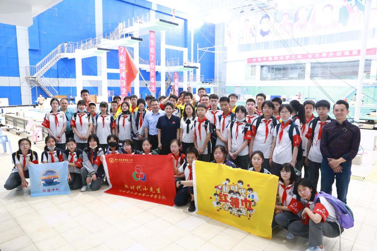 老师同学们和奥运冠军刘蕙瑕在跳水训练馆合影