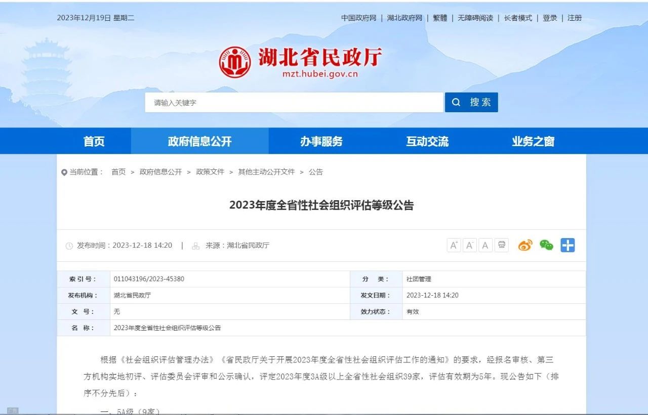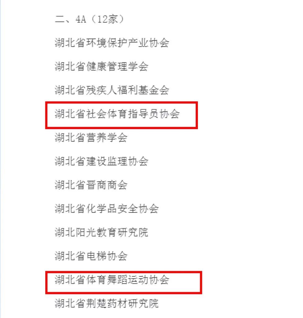 12月18日,湖北省民政厅发布2023年度全省性社会组织评估等级公告:根据《社会组织评估管理办法》《省民政厅关于开展2023年度全省性社会组织评估工作的通知》的要求,经报名审核、第三方机构实地初评、评估委员会评审和公示确认,评定2023年度3A级以上全省性社会组织39家,评估有效期为5年。其中省社体中心所属的2家协会:湖北省社会体育指导员协会、湖北省体育舞蹈运动协会,上榜获评为全省性“4A级社会组织”。