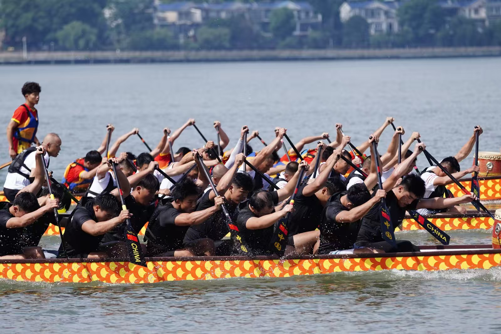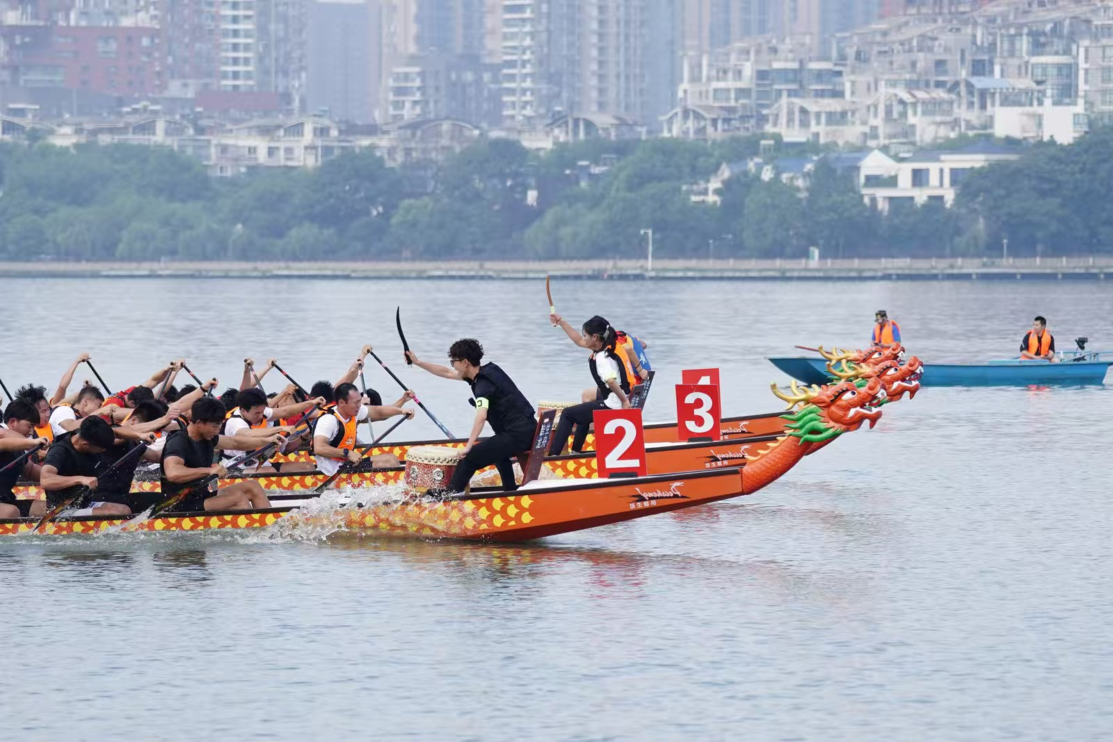在南湖水上运动中心,龙舟竞渡擂鼓开桨。各代表队劈波斩浪,动作整齐划一,鼓声号子震天响,将“同舟共济、奋楫争先”的龙舟精神演绎得淋漓尽致,成为武汉都市圈团结协作、携手并进精神的生动注脚。