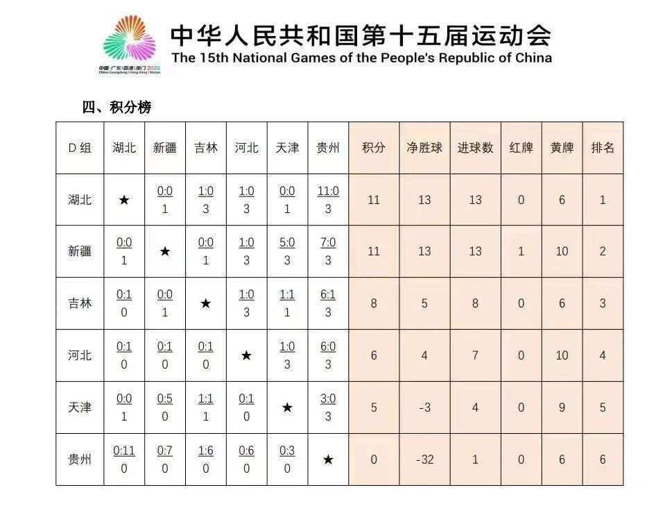 6月16日至29日,中华人民共和国第十五届运动会足球项目男子18岁以下组资格赛D组在河北省唐山市圆满收官。湖北男足U18队以5战3胜2平积11分、进13球未失一球的不败战绩,获得D组第一,成为第十五届全运会湖北体育代表团足球项目第10支晋级决赛阶段的队伍。