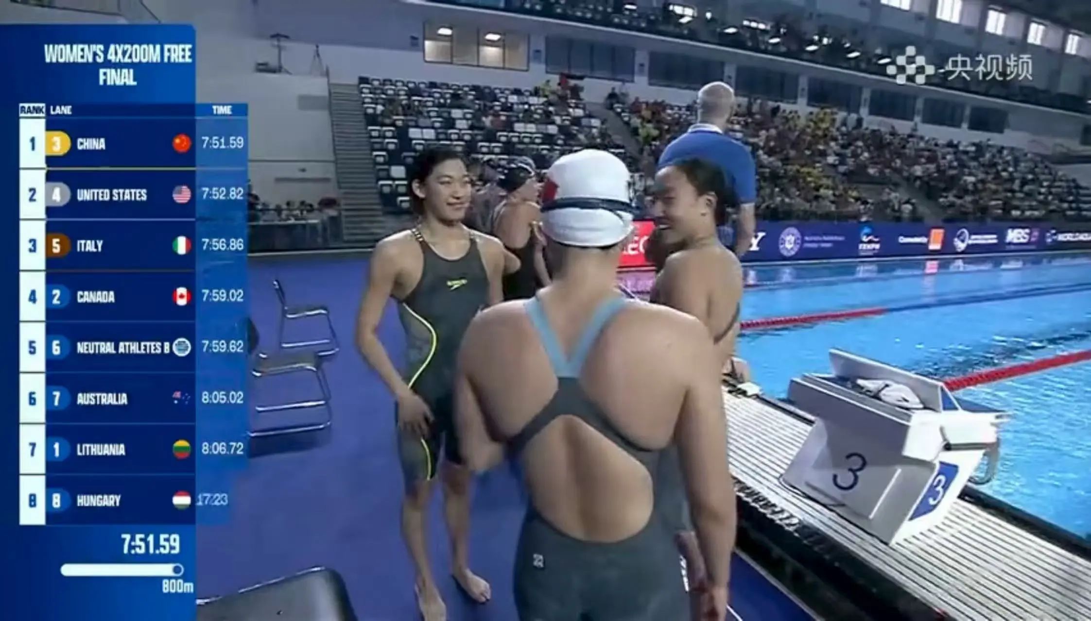 第4棒杨佩琪出发时仅落后0.02秒,50米转身后美国选手占据领先位,随后试图拉大领先优势,但杨佩琪紧逼不舍,最后一个50米转身前杨佩琪发力追击,转身后稍稍领先对手,双方肩并肩起腿冲刺,杨佩琪充分施展出冲刺能力强的特点,将领先优势越拉越大,最终甩开对手近一个身位触边。
