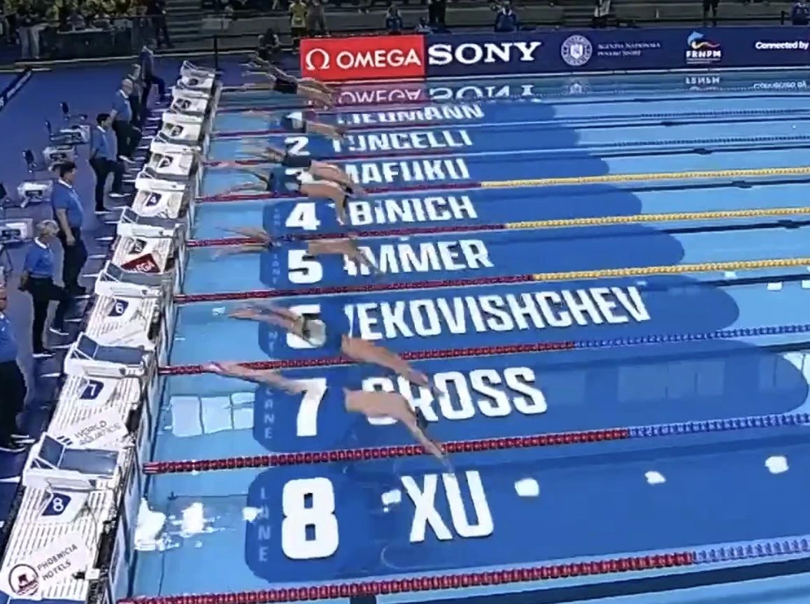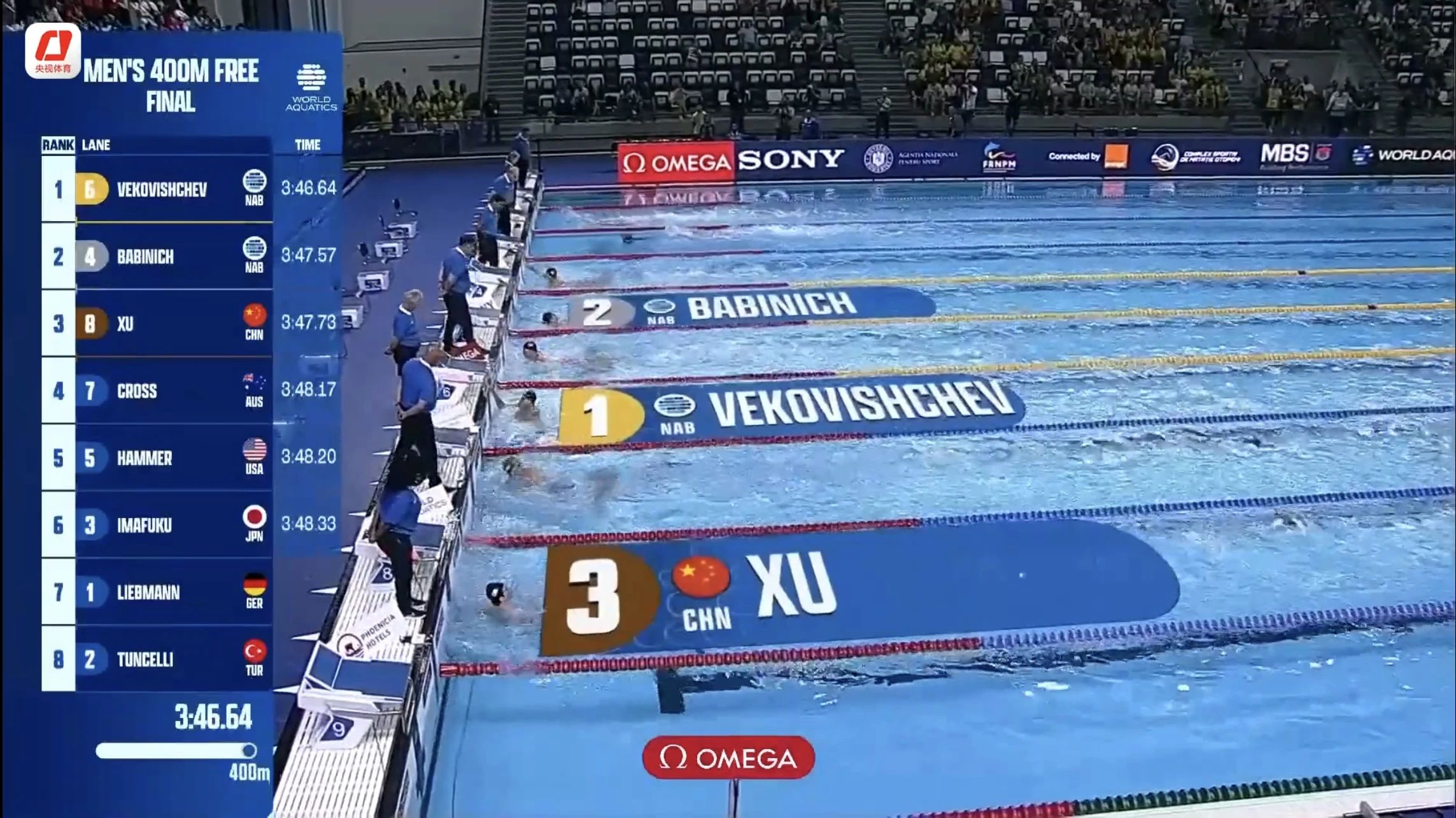 徐海博近一年多来,中长距离自由泳整体实力提高较快,400米自去年全锦赛尚在3分52秒开外,今年春锦赛就游出了3分48秒53的好成绩,今天的3分47秒73是在首次参加世青赛中游出,其越是大赛越敢拼、越能拼的气质难能可贵。能打开3分48秒大关,已进入亚洲一流水平,若能打开3分47秒大关,则是世界一流水平。