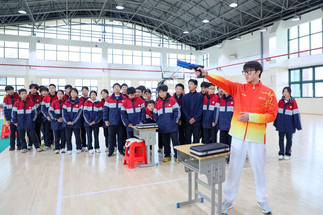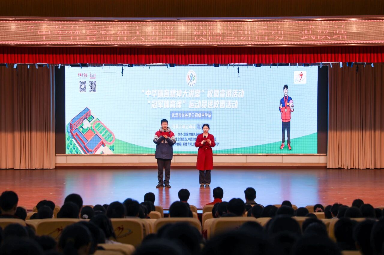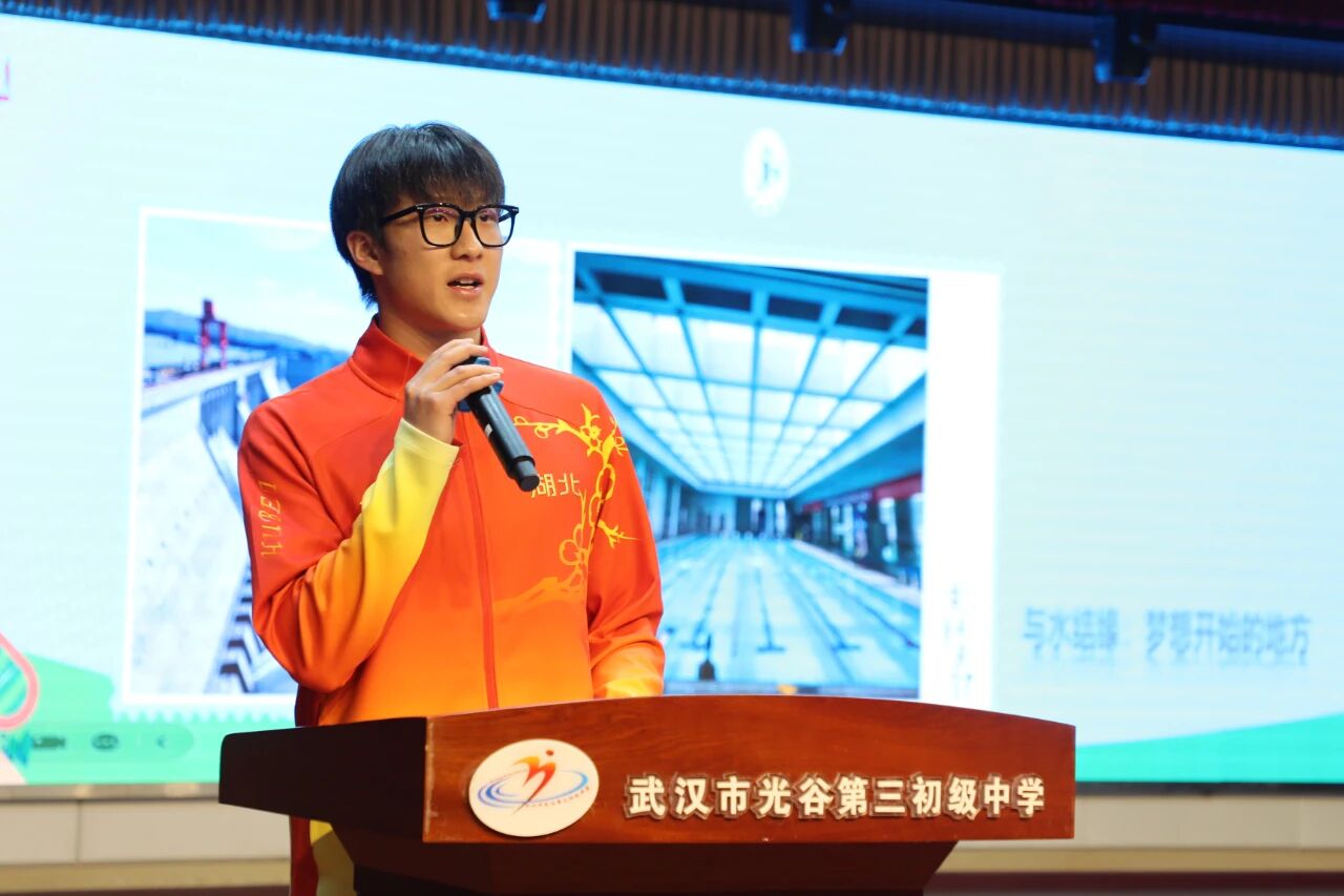 “好帅啊,我们见到冠军了!”12月5日,武汉市光谷第三初级中学的报告厅内热闹非凡,“中华体育精神大讲堂”校园宣讲活动、“冠军体育课”运动员进校园活动在学校举办,第十五届全运会老现代五项冠军陈柏良来到现场,给同学们上了一堂“特别的”体育课,通过分享励志成长故事,将中华体育精神传递给在场的师生,鼓励同学们学会坚持,成为最棒的自己。