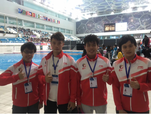 获得4X50米男女混合泳接力第八名的广西小将(从左至右莫子彦、唐铭骏、莫匡凯、乐云关)