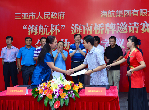 近日,海南省三亚市人民政府与海航集团签约,海航集团从2012年起连续5年独家冠名赞助该项赛事,此赛事已被国家棋牌管理中心列为国家级赛事。自此,国家顶级桥牌赛正式落户海南。