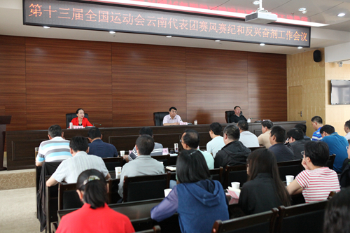 7月26日,云南省体育局召开第十三届全运会云南代表团赛风赛纪和反兴奋剂工作会议,贯彻落实国家体育总局第十三届全国运动会赛风赛纪和反兴奋剂专题会议精神,对十三届全运会的组织及备战工作进行再动员、再部署、再要求,以“零容忍”的坚决态度、更完善的防范手段,更严厉的处罚措施,认真做好全运会赛风赛纪和反兴奋剂工作。宁可不拿金牌、也不铤而走险,宁可丢比赛,也不丢人格,确保万无一失。