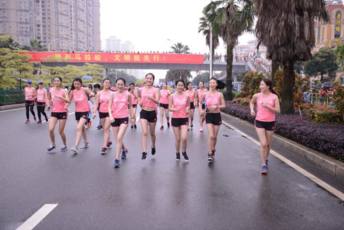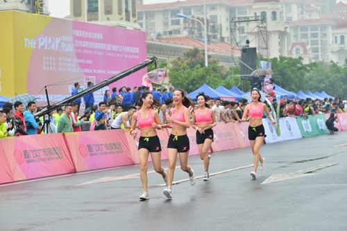 厦门海沧女子半马无惧风雨 粉红色刷晴海沧赛道