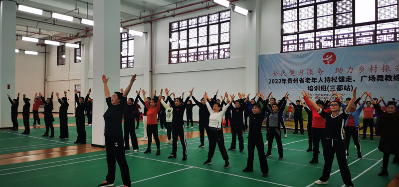 3月12日,由贵州省老体协主办的“全民健身服务·助力乡村振兴”2022年贵州省老年人持杖健走、广场舞教练员系列培训活动结束。本次培训历时13天,先后在黔南州三都县、遵义市桐梓县、六盘水市盘州市、铜仁市玉屏县4地进行理论知识和实操技能培训。来自贵州省的520余名健身骨干参与培训。