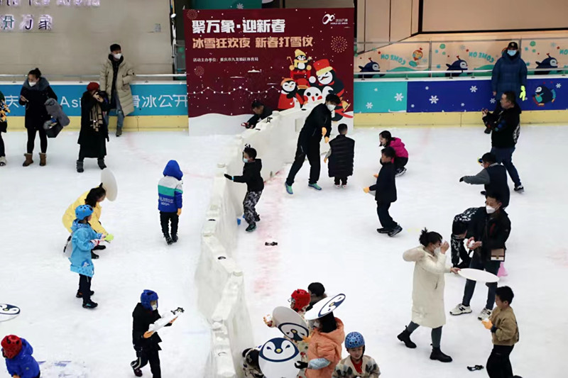 1月15日,在重庆九龙坡区冰纷万象滑冰场,人们尽情地打雪仗、堆雪人,一场“聚万象·迎新春 冰雪狂欢夜 一起打雪仗”活动火热进行。作为九龙坡区迎新消费促进季体育消费系列活动之一,本次活动由九龙坡区体育局主办,面向市民免费开放。