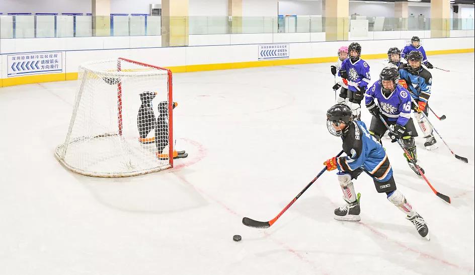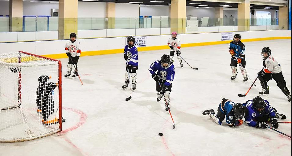 如果在周六,来到五环冰雪馆内游玩,就能看见一群衣着特别的孩子。他们身穿厚厚的头盔护具,脚踩冰刀鞋,手拿冰球杆。
