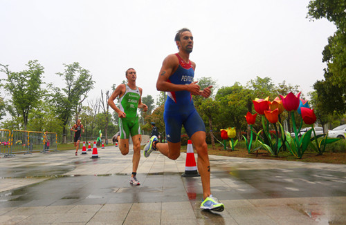 今天镇江阴雨绵绵,气温较低,水温仅有18.1度,运动员可穿着防寒泳衣比赛。上午9时,男子优秀组比赛准时发枪,在游泳赛段中来自成都军区的徐正以18分44秒率先上岸进行换项,白发全紧随其后,爱尔兰选手本杰明·肖排在第三位。自行车赛段选手需绕金山公园骑行6圈,八一队的姜智航在第二圈时奋起反扑,但很快被本杰明·肖、安德雷斯以及山东队的刘忱超越,最终刘忱以56分18秒的优异表现第一个完成自行车赛段比赛。10公里跑赛段设在金山公园内,此前领先的刘忱由于体能下降逐渐掉队,爱尔兰选手本杰明·肖后程发力摘得桂冠。
