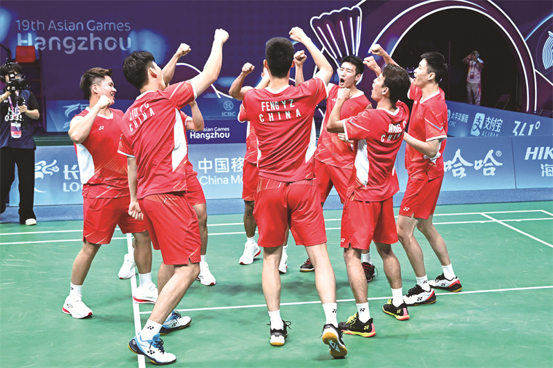 9月29日,亚运会羽毛球项目男团1/4决赛中国队对阵中国台北队。在第一场“一单”告负后,梁伟铿、王昶、李诗沣三位“00后”小将顶住压力,扛起重任。第二场梁伟铿/王昶挑战东京奥运会冠军李洋/王齐麟,一路打得很顽强,将大比分追平,之后李诗沣、刘雨辰/欧烜屹再胜对手,最终锁定胜局,帮助中国队晋级四强。“这次比赛我们秉承‘落后不放弃’的信念,要打出中国队的精气神。”王昶说。