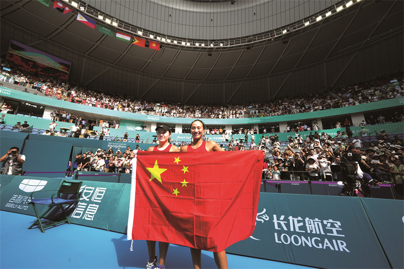 第一次身穿国家队战袍出战亚运会让郑钦文感到为国而战的荣誉和自豪。9月29日,在直落两盘战胜队友朱琳之后,郑钦文终于成功圆梦,赢得网球女子单打项目金牌,并锁定巴黎奥运会参赛资格。她也兑现了自己的诺言,“我为国家打,不管单打还是双打,我都会全力以赴。”郑钦文说,与个人出战大满贯等职业赛事不同,身穿印有国旗的战袍出战亚运会非常自豪,“这块女单金牌,这个荣誉属于国家,很开心我与朱琳携手为网球迷们呈现了一场精彩的比赛。”为了国家的荣誉,不擅长双打的郑钦文,选择和朱琳配对参加女双比赛,而朱琳更是一人身兼三项,女单、女双和混双连轴转。朱琳说:“代表国家比赛,这次肩负的责任会更多一些。”