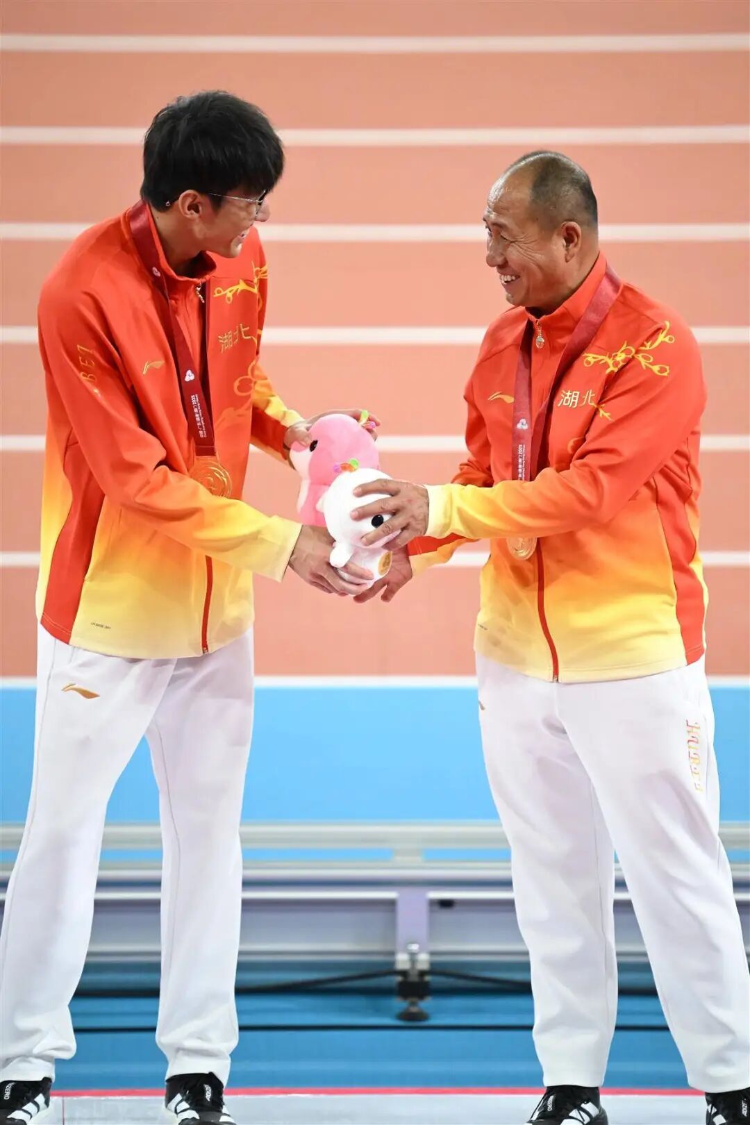 11月17日,全运会新科男子百米冠军李泽洋(左)和教练翟进明在领奖台上交换吉祥物。(新华社发)