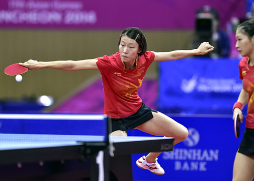 10月3日,仁川亚运会乒乓球女双决赛在仁川水源体育馆举行,中国组合朱雨玲/陈梦以4比2战胜队友夺得金牌。